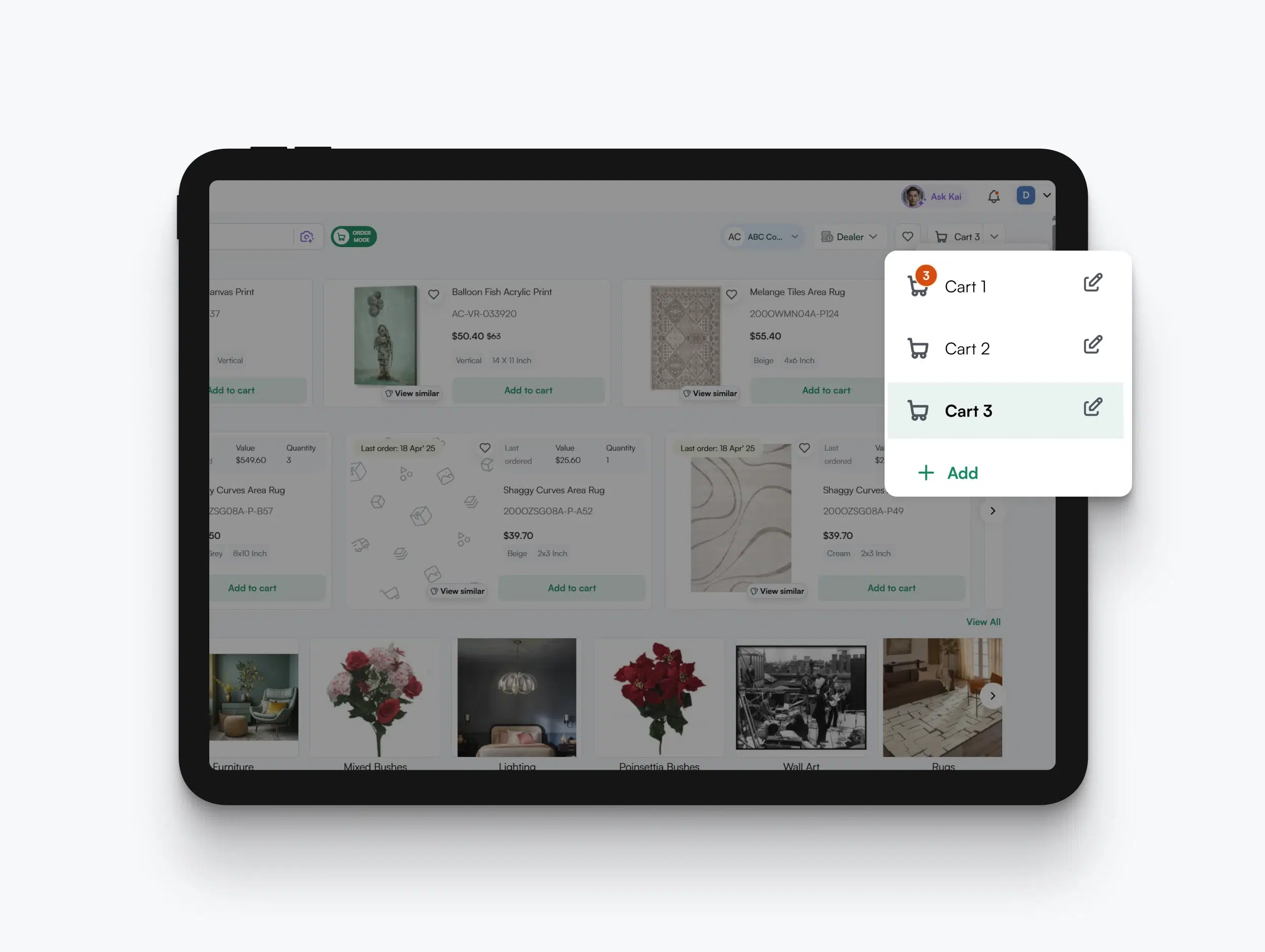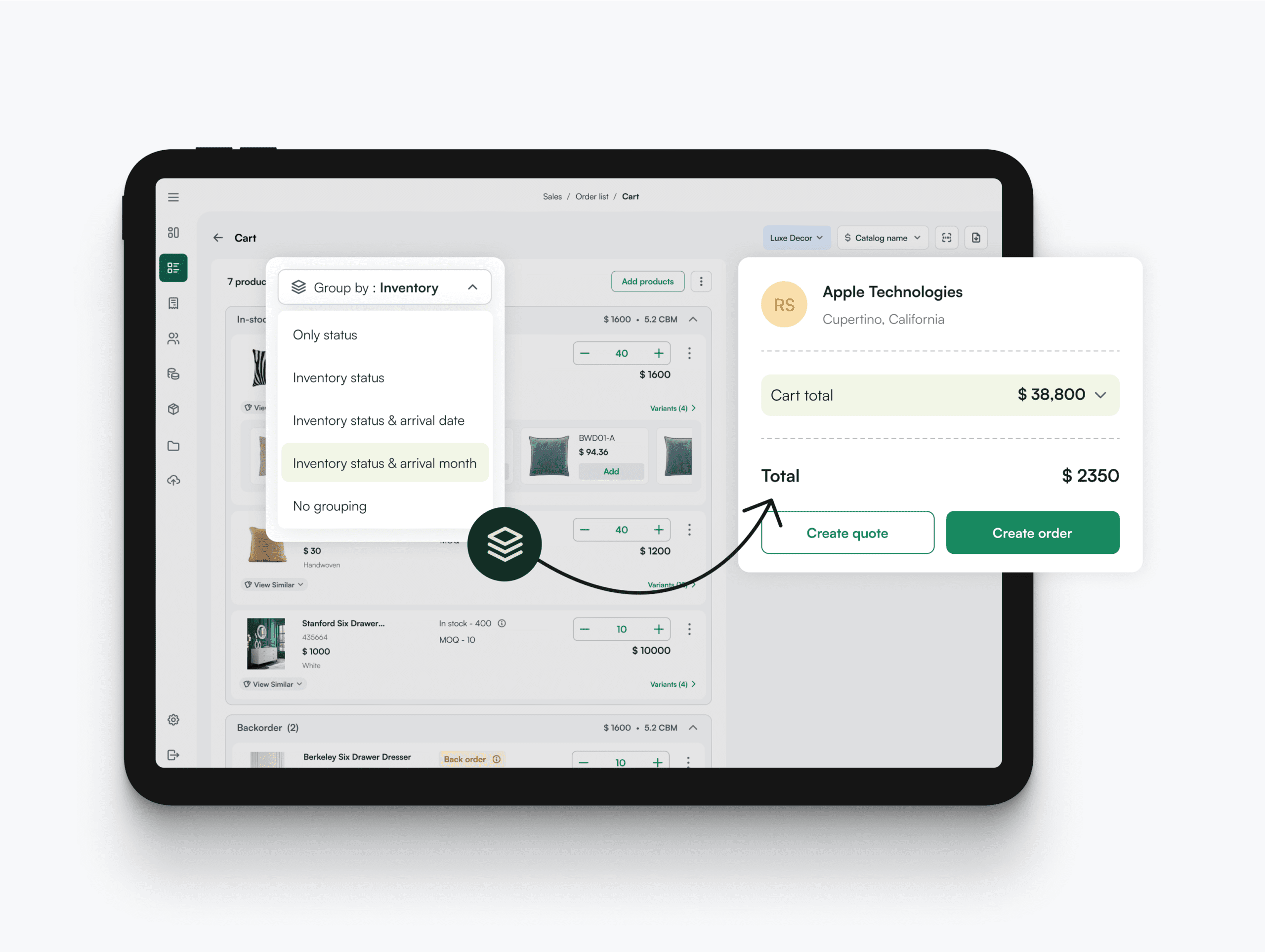 This feature allows users to organize their cart items into visual groups based on criteria like inventory status, expected arrival times, and custom-defined categories like lighting, furniture, or backyard items.