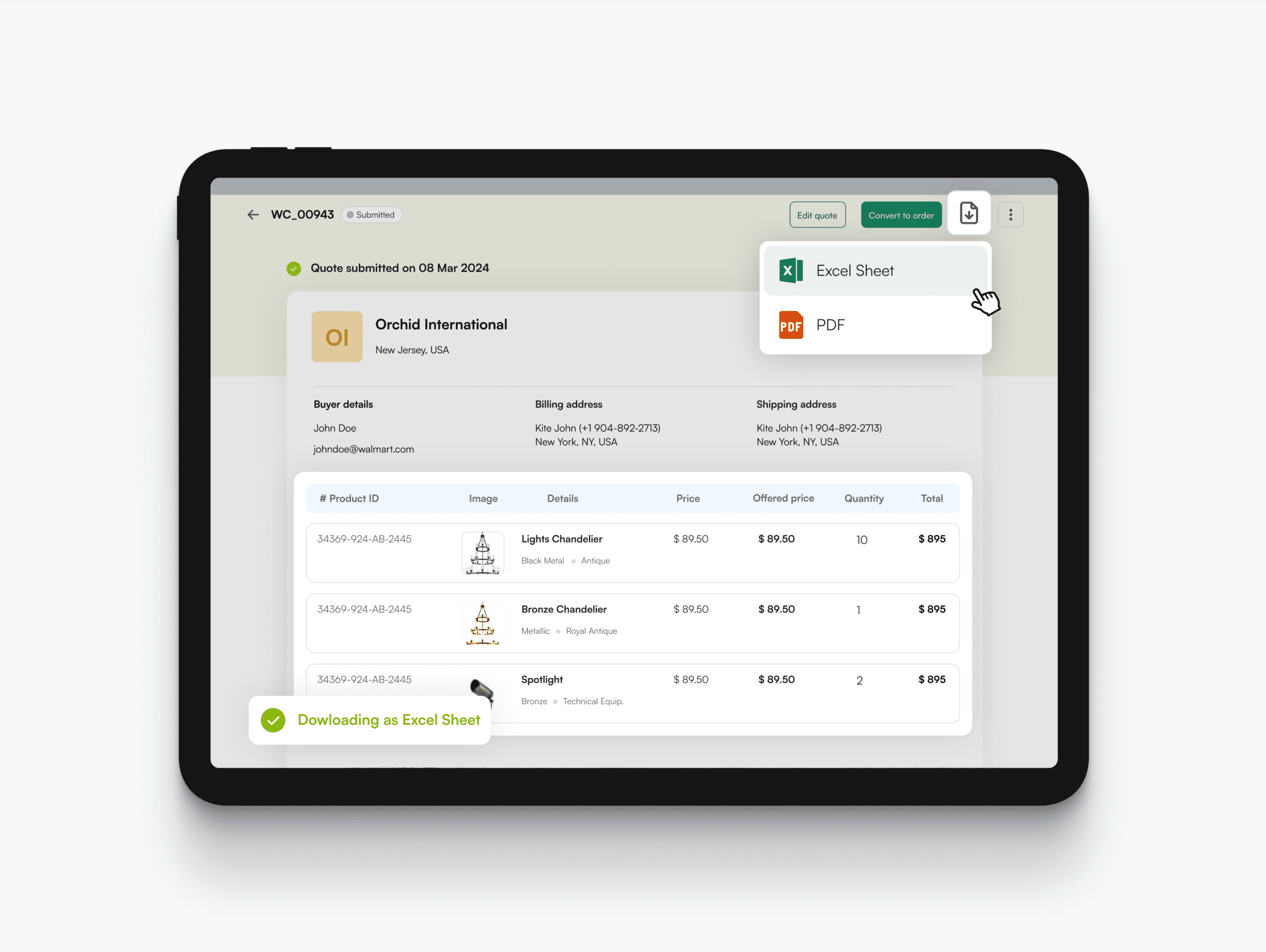 Now, you can download your order and quote forms in PDF format and as Excel sheets.