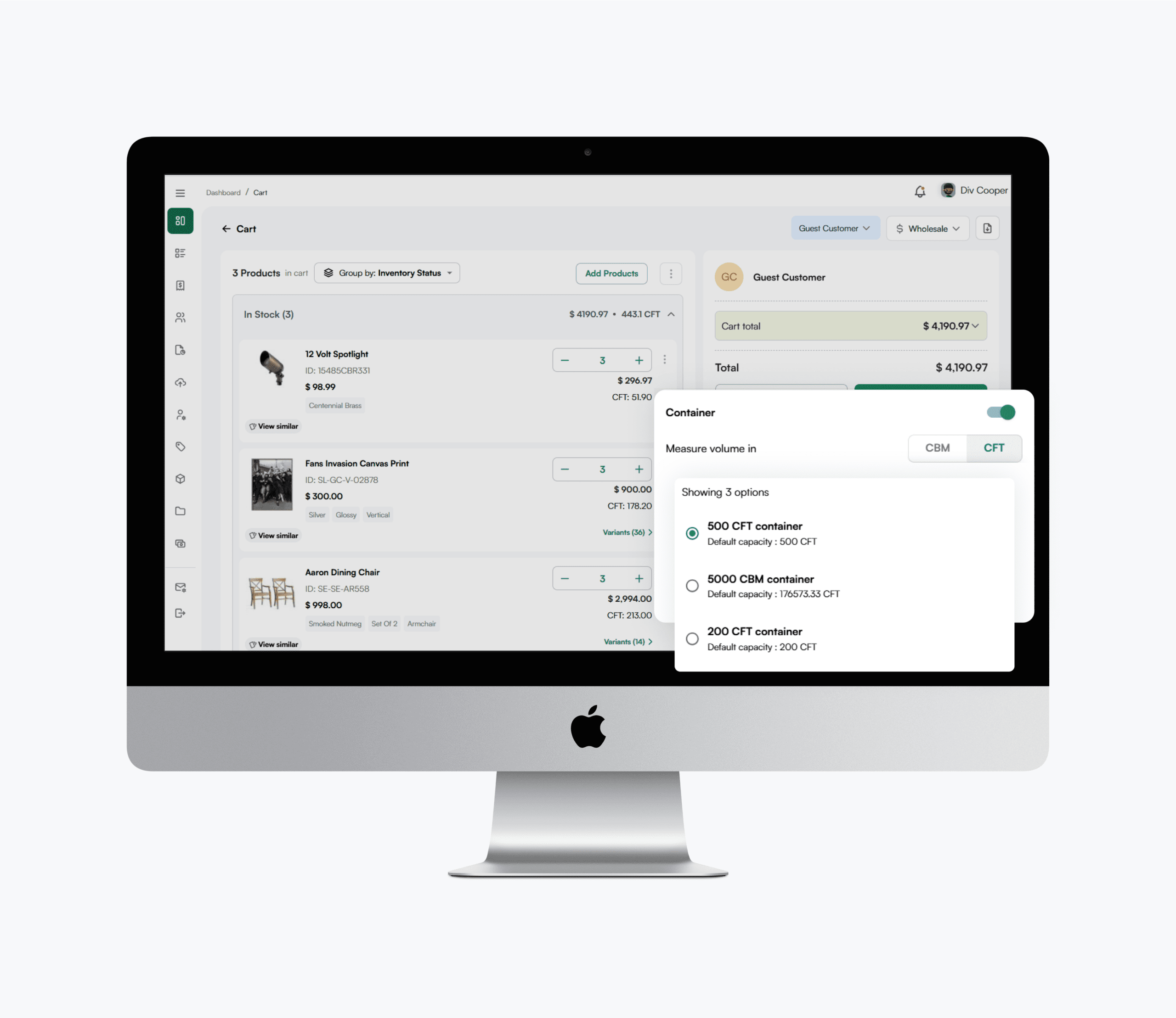This feature helps you figure out how much space/volume your order will take up in different shipping container sizes. Doing this lets you easily choose the best shipping options and decide the freight and shipping terms.