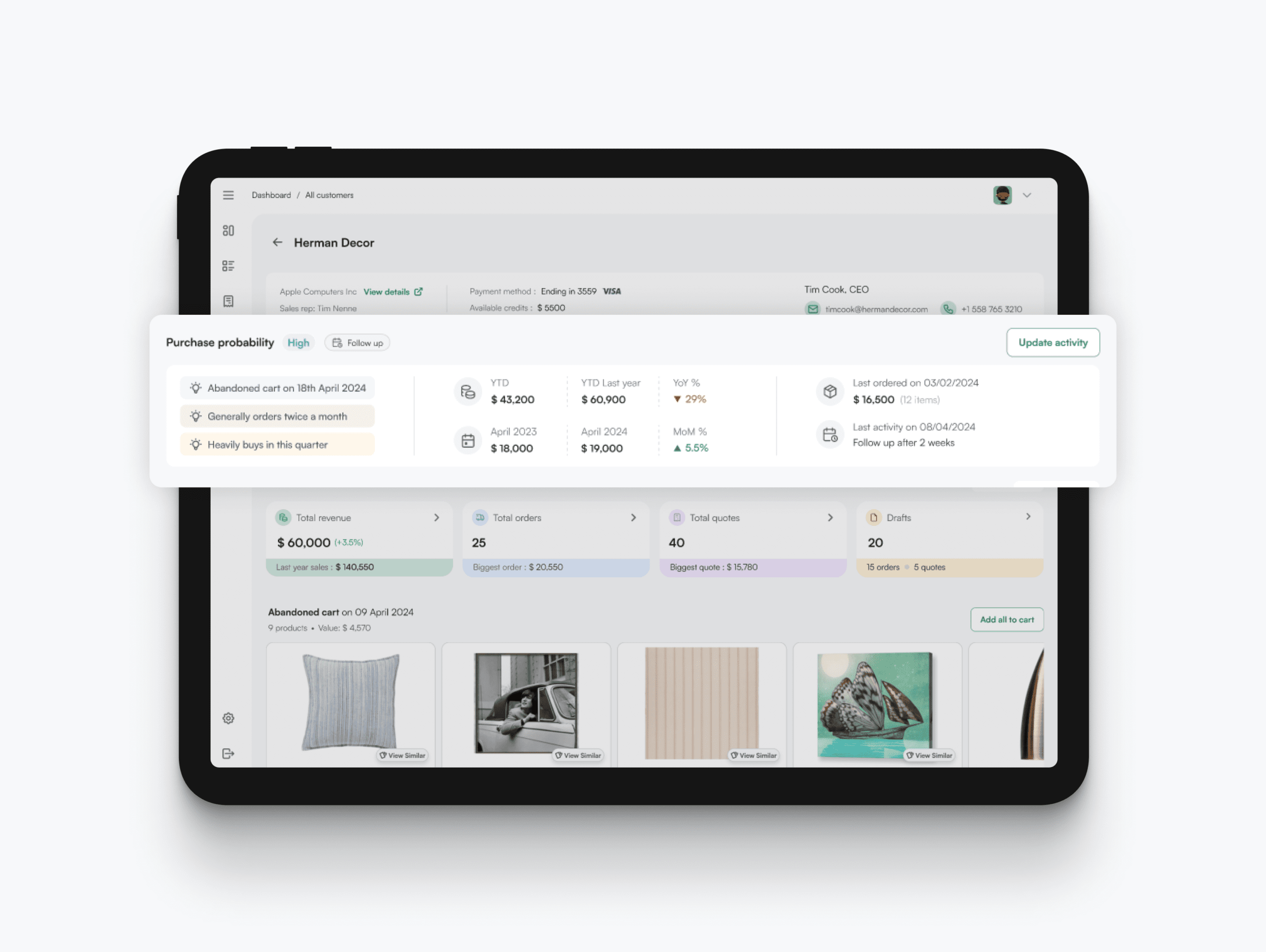 Sales reps often have to rely on intuition, with no data to guide them in their pursuit of increasing month-on-month sales. This feature uses AI to get actionable insights from three years of sales data, guiding reps on customer preferences and effective strategies.