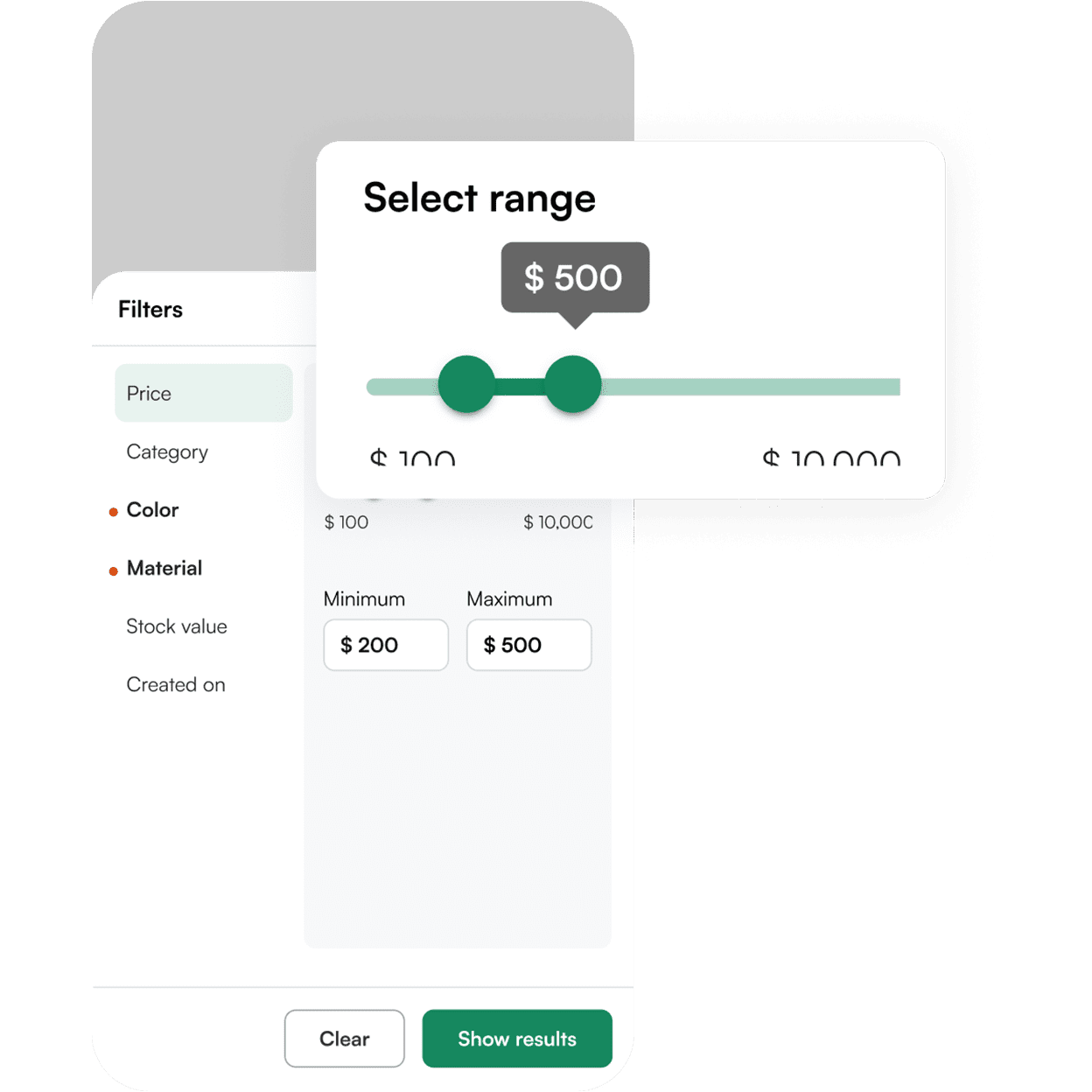 Filter by any catalog attribute, such as in-stock status, price range, materials, sizes, or custom combinations—streamlining inventory management.