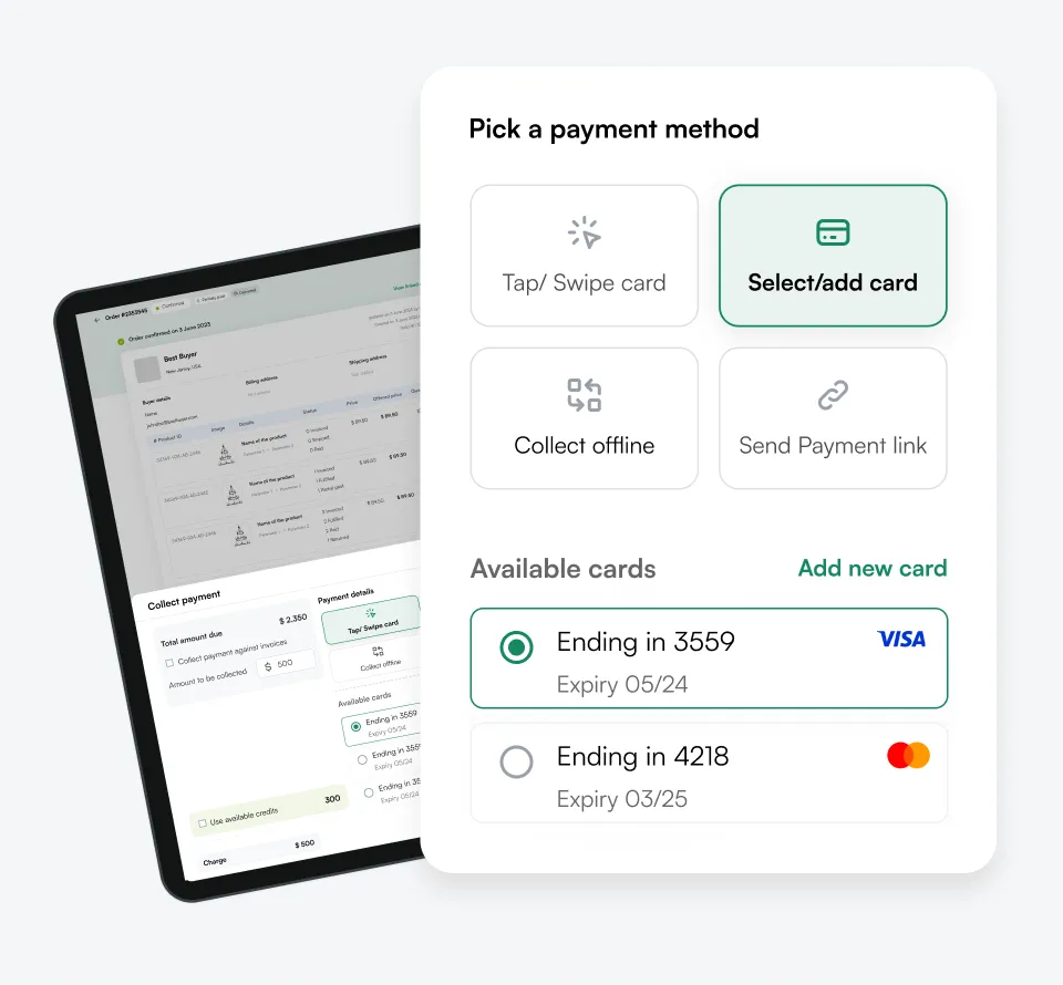 Safely store customer card or bank details when adding a buyer or placing orders. Charge later based on your payment terms!