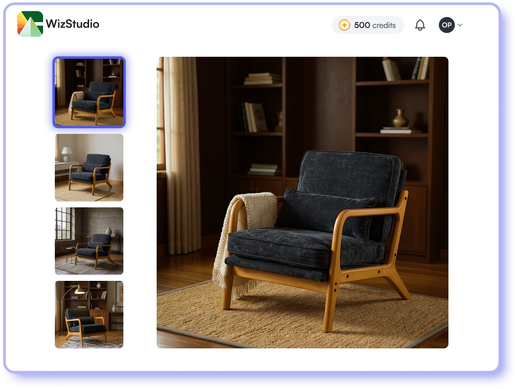 WizStudio works across a wide range of categories, including home décor, furniture, lighting, rugs, textiles, apparel, jewelry, and gifting. Each category is powered by specialized AI pipelines designed to capture its unique look and feel.